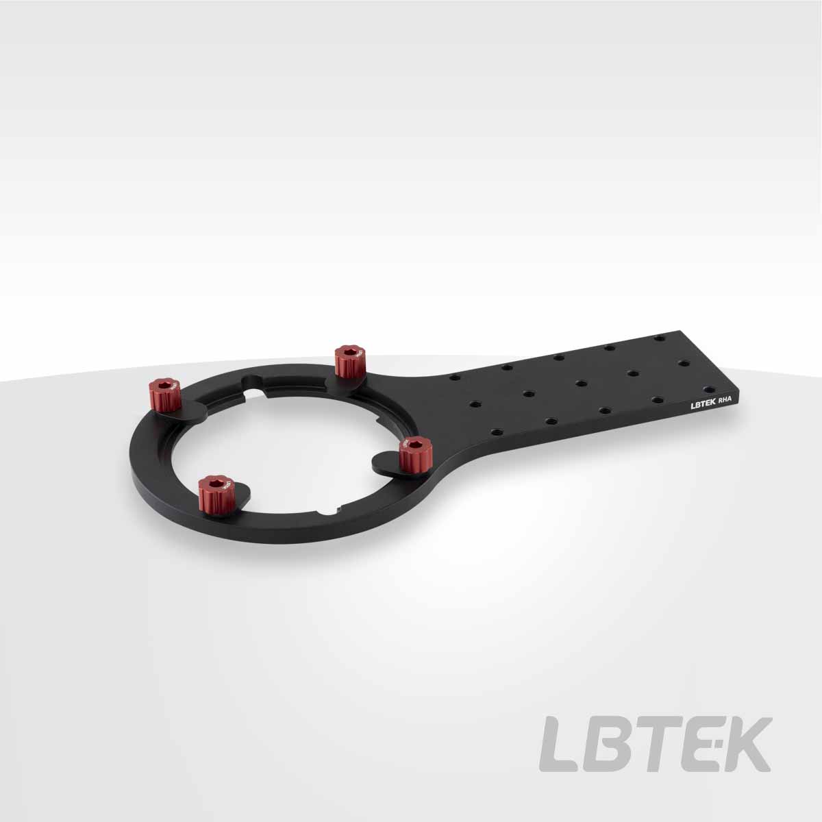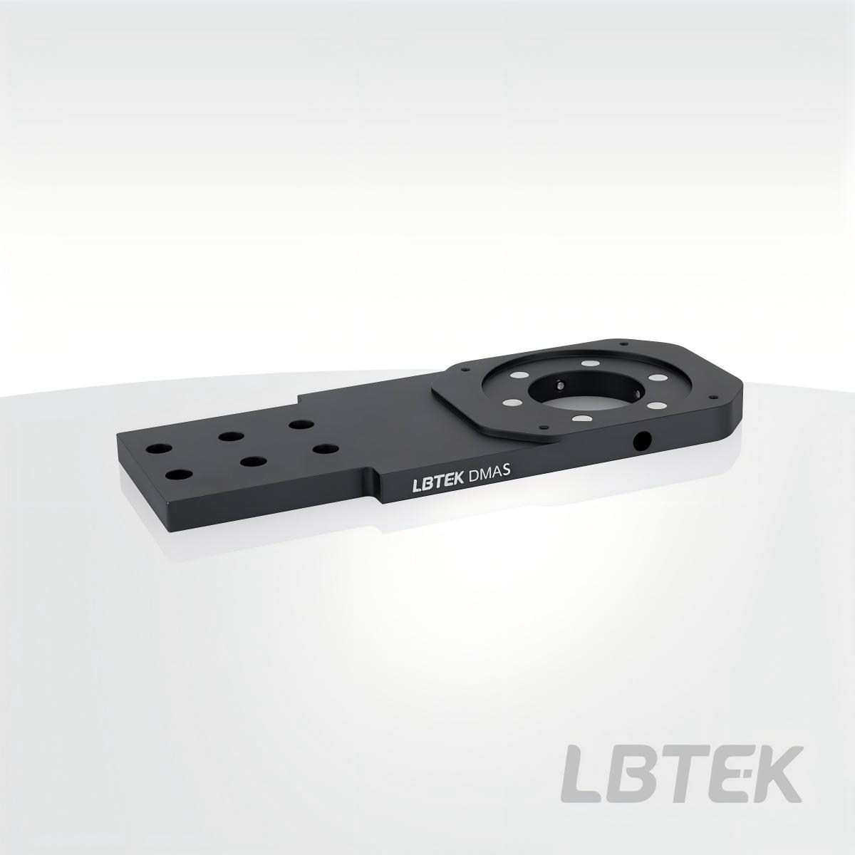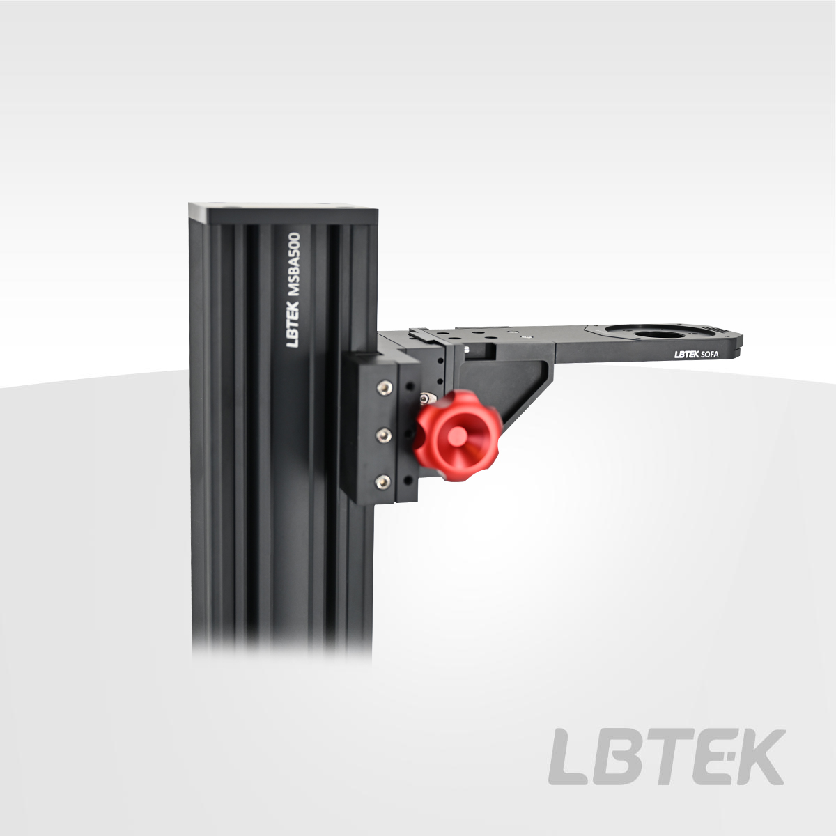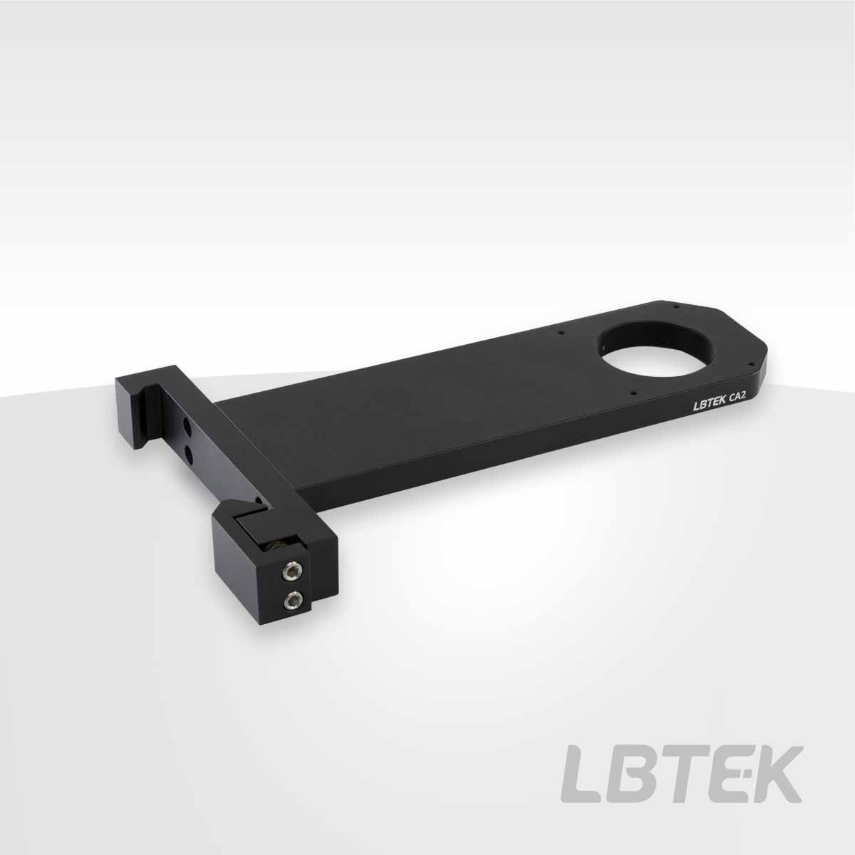 LBTEK mounting arm, used to install the objective lens mount onto a manual focusing stage. The objective lens mounting hole on the arm features a φ38.2 mm female dovetail, compatible with five-objective lens mounts, dual-objective lens mounts, and single-objective lens mounts (requires a dovetail adapter for use). The magnet on the upper part of the mounting arm is used to attach the light-blocking bellows on the main bracket with epi-illumination arm, forming a light-tight optical path between the mounting arm and the epi-illumination arm to prevent interference from external light.