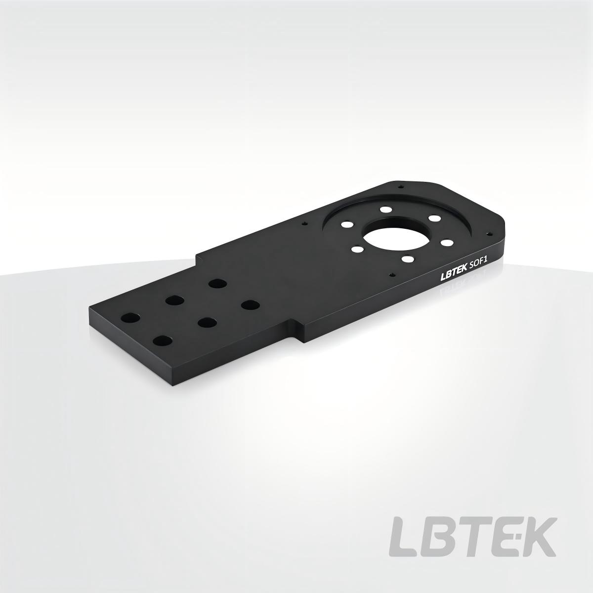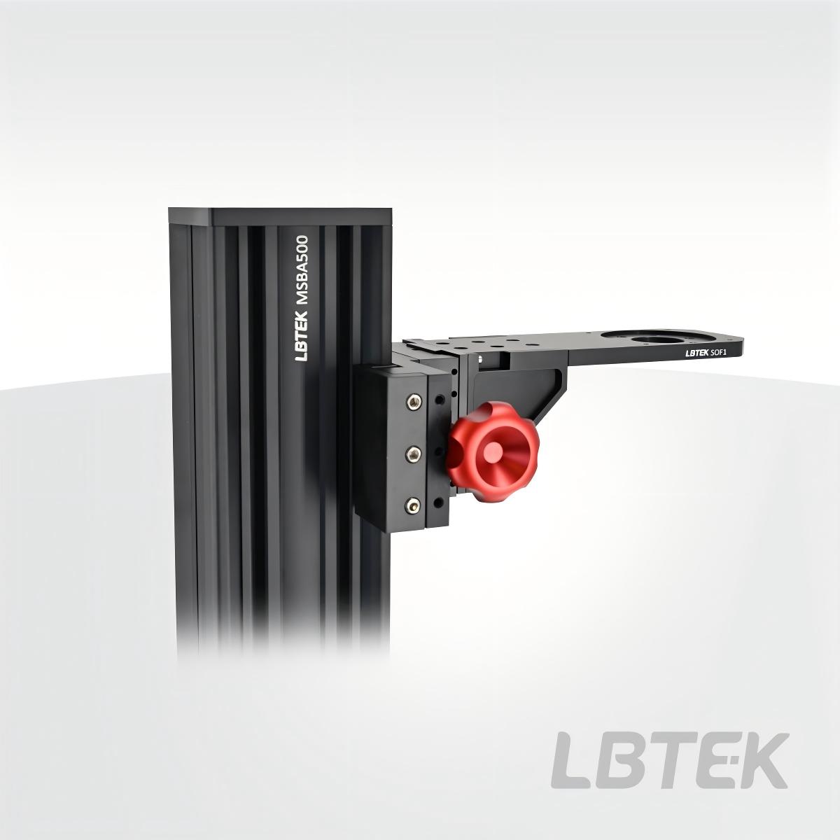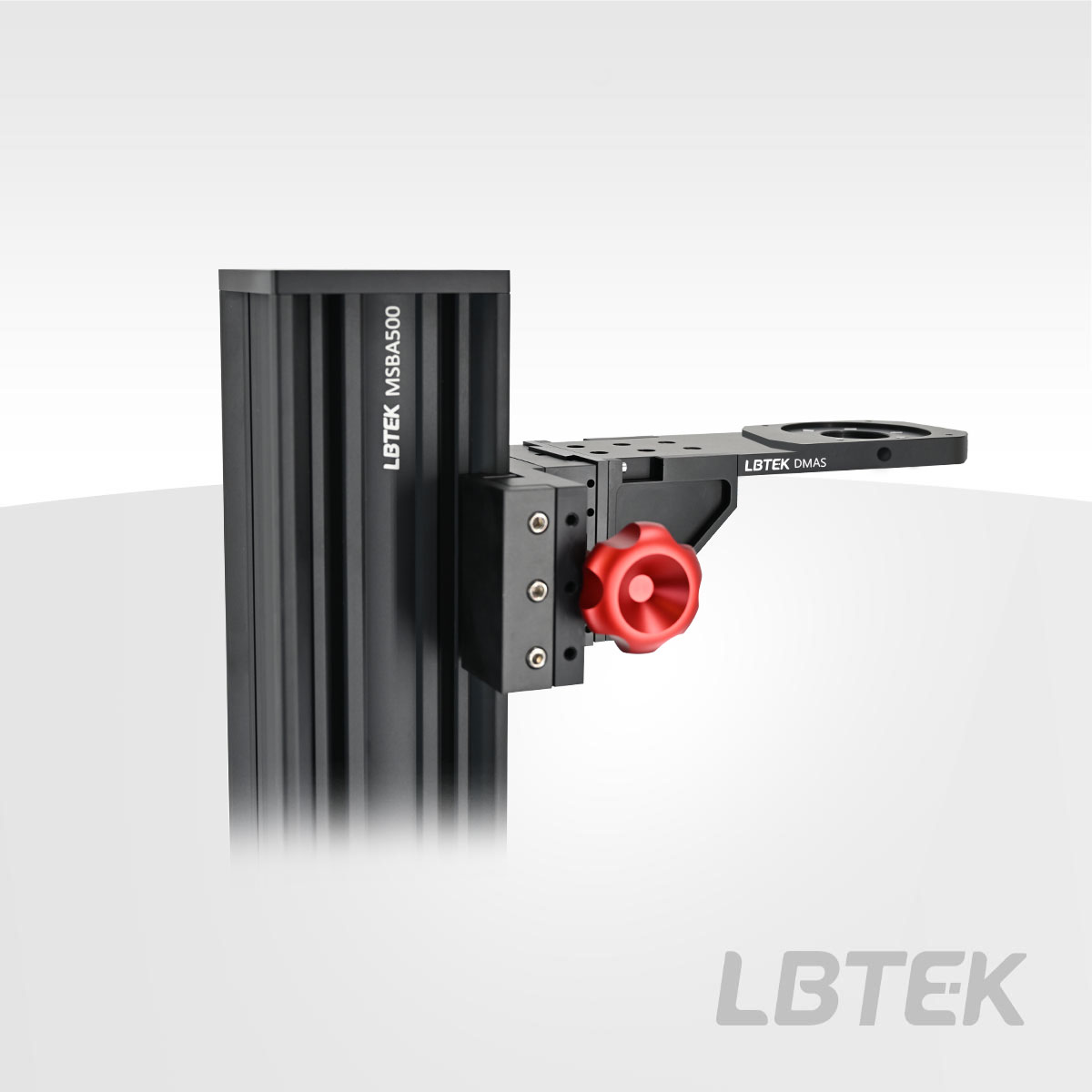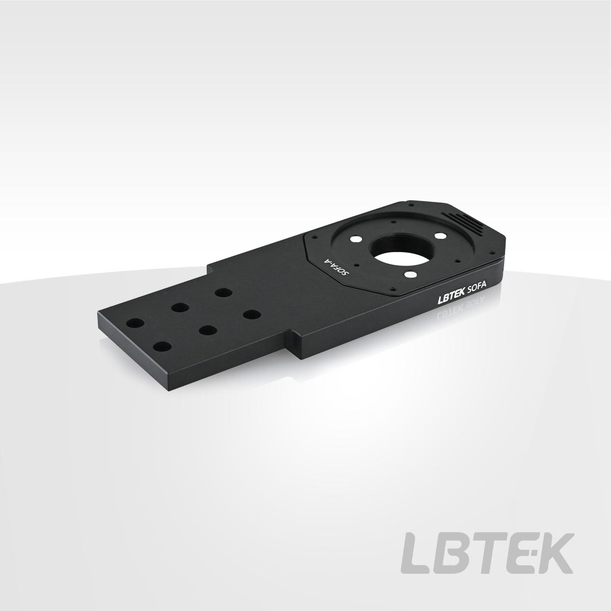 LBTEK mounting arm, used to install the objective lens mount onto a manual focusing stage. The objective lens mounting hole on the arm features a φ38.2 mm female dovetail, compatible with five-objective lens mounts, dual-objective lens mounts, and single-objective lens mounts (requires a dovetail adapter for use). The magnet on the upper part of the mounting arm is used to attach the light-blocking bellows on the main bracket with epi-illumination arm, forming a light-tight optical path between the mounting arm and the epi-illumination arm to prevent interference from external light.