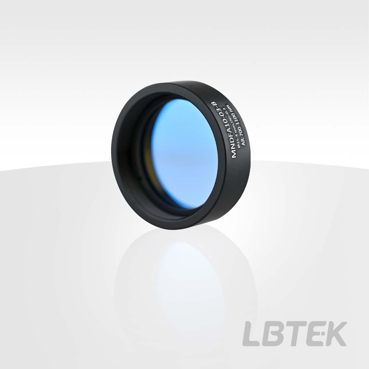 The LBTEK absorptive neutral density filters have an optical density (OD) range of 0.1-6.0, with a size of 1 inch, and are coated with an anti-reflection coating for 700 nm-1100 nm. All MNDFA series absorptive neutral density filters come mounted in detachable standard lens tubes, with the surface engraved with product model, working wavelength, OD value, and other parameters for easy identification. The MNDFA series of absorptive neutral density attenuators are pre-installed in a removable standard lens sleeve. Parameters such as the product model, operating wavelength, and OD value are engraved on the surface for quick identification. Note: The thickness of the absorptive neutral density filter is for reference only. The actual thickness depends on the optical density of the batch of glass used.