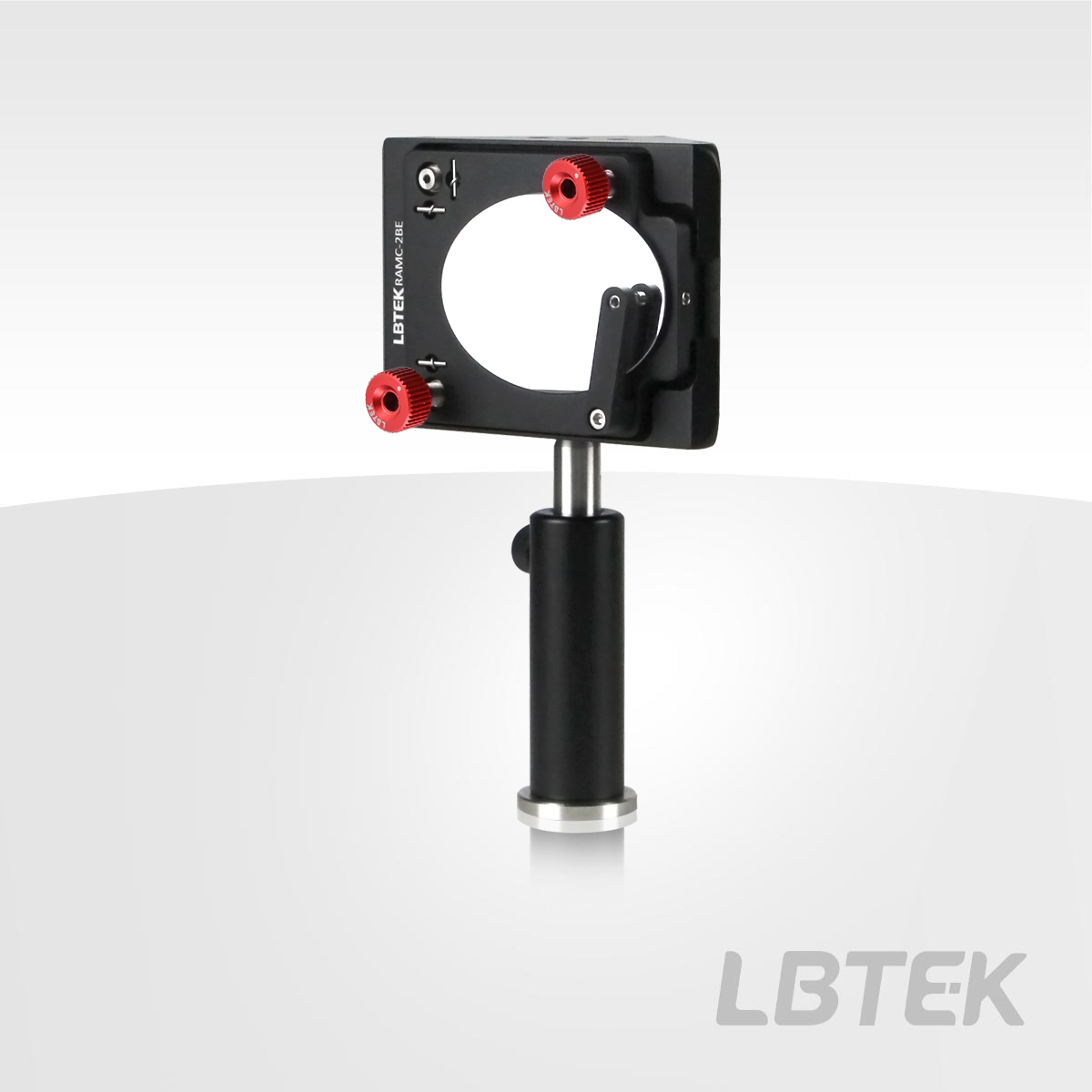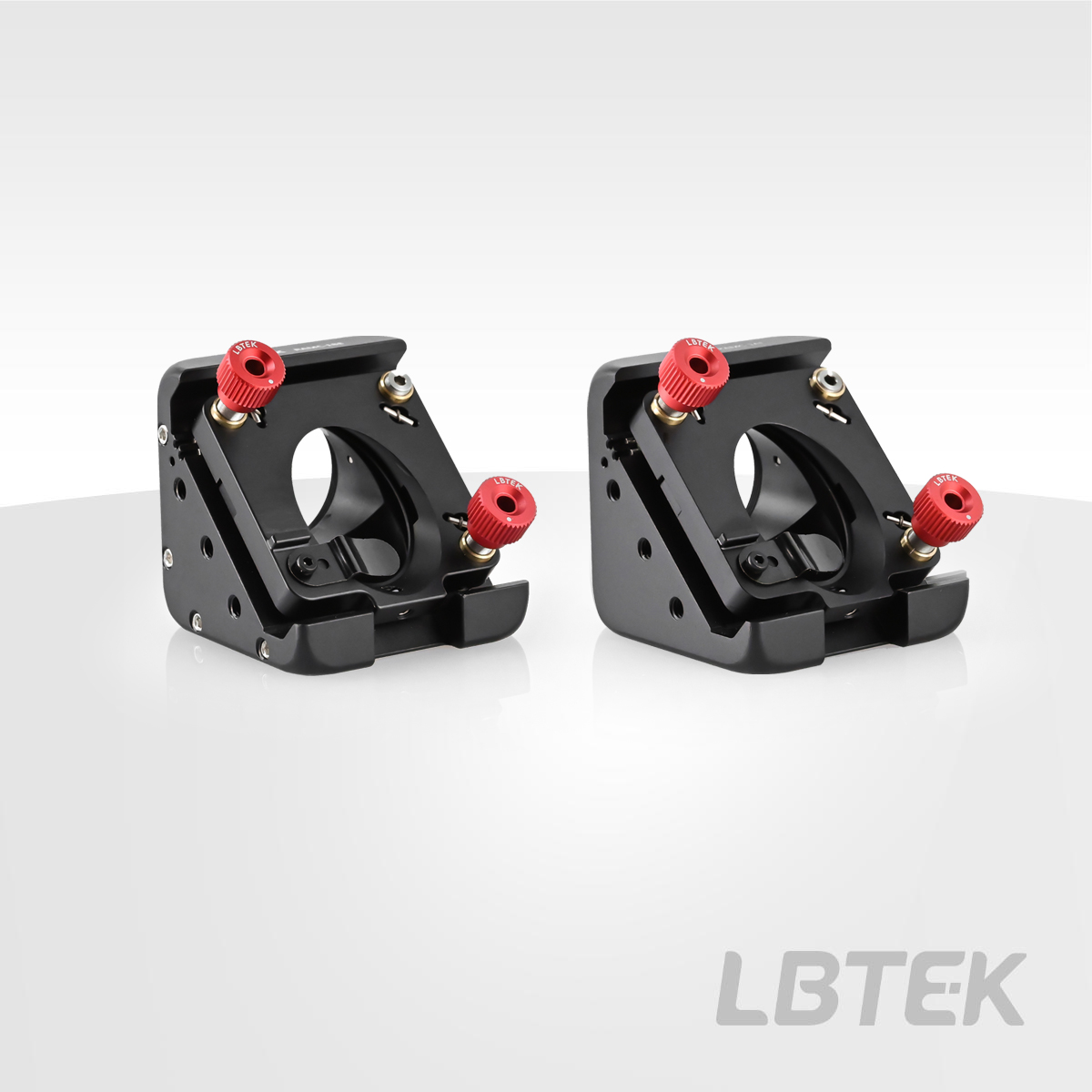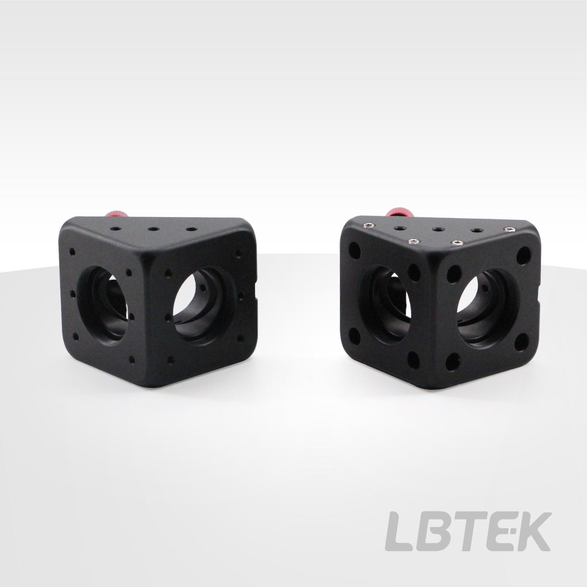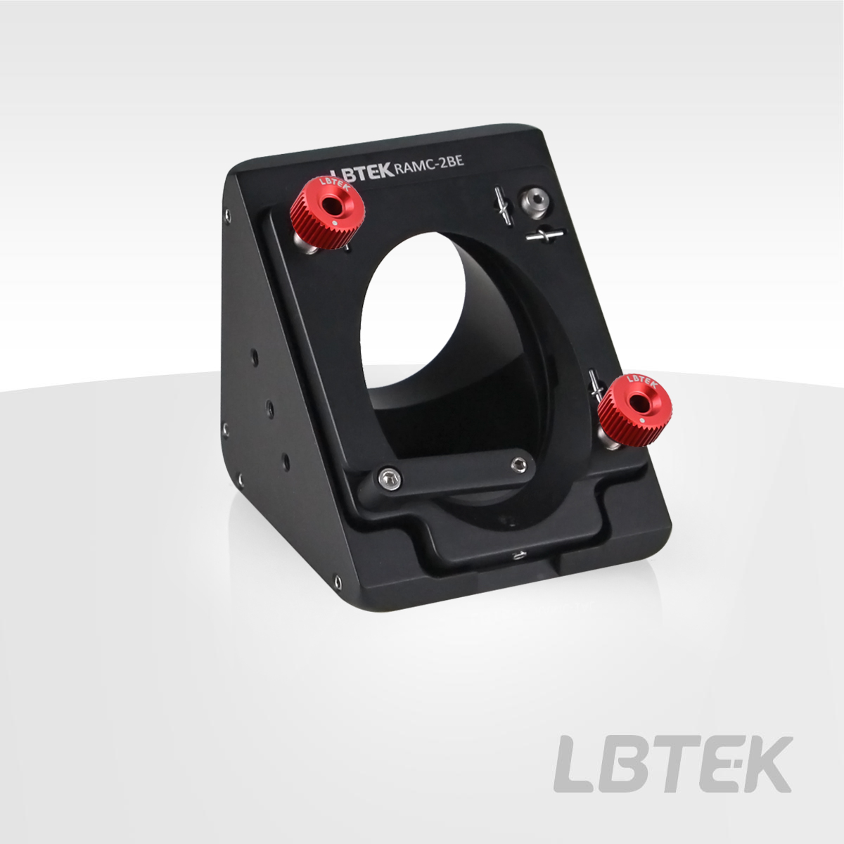 The LBTEK Coaxial System Right-Angle Mount is designed for 45° elliptical mirrors, compatible with 60 mm coaxial systems and suitable for compact system integration. The mount features SM2 tapped holes on both input and output end faces, compatible with SM2 lens tubes. Its bevel accommodates elliptical optical components (major axis 71.8 mm, minor axis 50.8 mm, thickness 12 mm).The optical component is secured by side rubber-tipped set screws and an arm-mounted rubber-tipped screw (screw penetration depth adjustable for component thickness). Three integrated adjusters provide ±3° pitch and yaw adjustment and ±3 mm linear translation. The end faces are perpendicular with smooth bores, compatible with Ø6 mm coaxial posts. Side-mounted M6 and M4 tapped holes enable mounting onto optical posts.