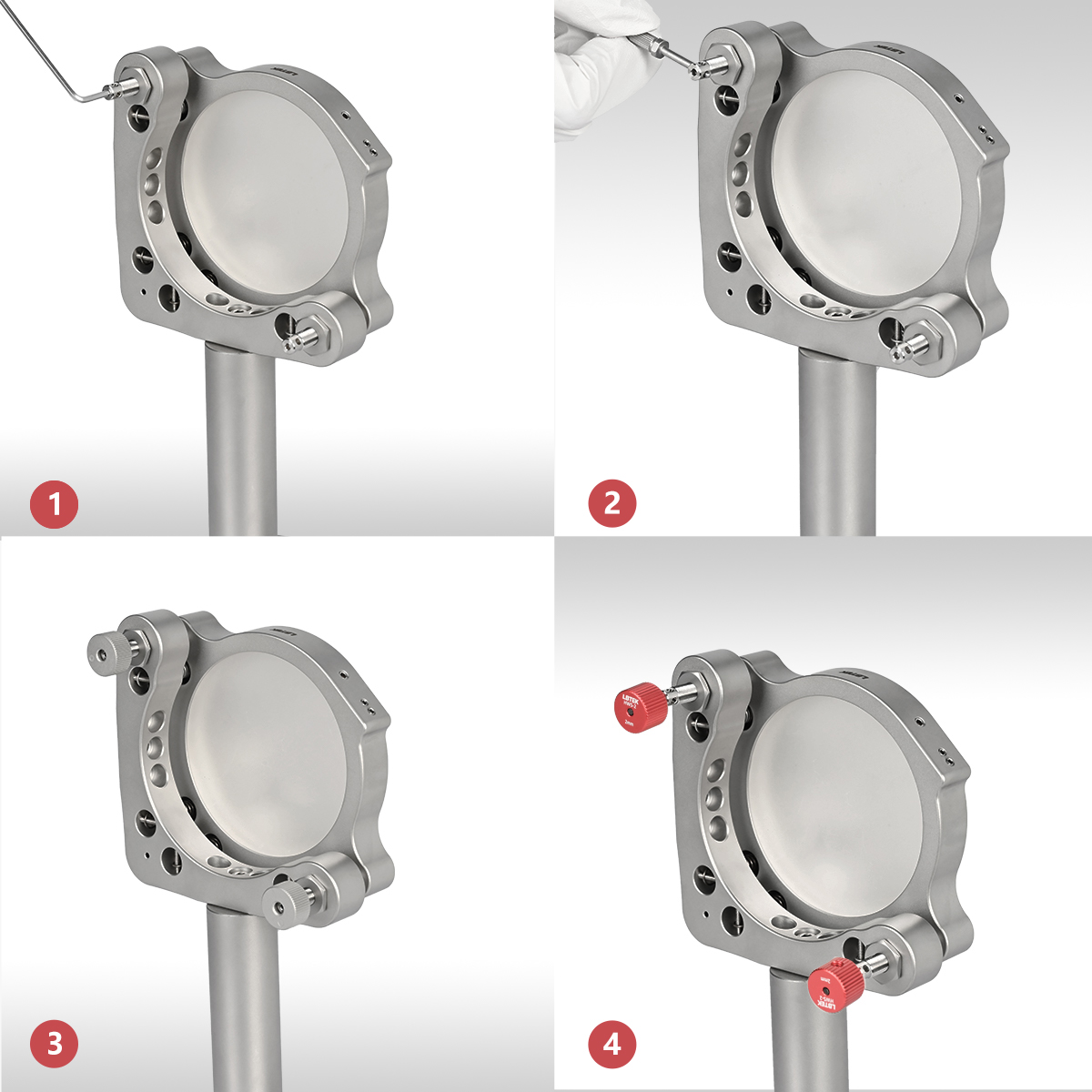 LBTEK 3-inch stainless steel lens mount for mounting optical components with a diameter of 76.2 mm. The optical component is secured via flexible spring leaves and fixing screws. Two M6×0.25 precision adjusters provide the adjustment mount with an angular adjustment range of ±4°. Comes without knobs but with lock nuts; adjustment without knobs requires the use of a hex key. The adjusters feature side through-holes for easy insertion and precise adjustment. The optical adjustment mount has M4 countersunk mounting holes on the side. Includes two M4 thin-head hex socket screws and one each of 2.0 mm and 2.5 mm hex keys with purchase.