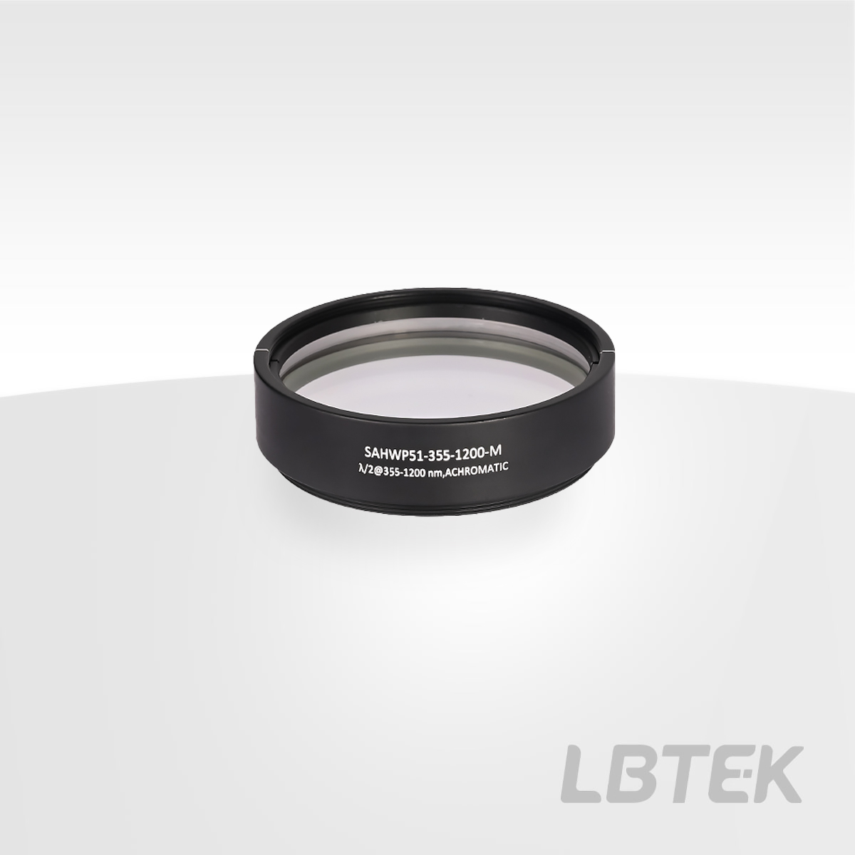 LBTEK's super achromatic half-wave plate with a clear aperture of Ø45 mm is composed of three quartz wave plates and three MgF2 wave plates bonded together. By controlling their relative angles, it achieves an ultra-broadband achromatic effect. Standard products are available with working wavelength ranges of 355-1200 nm and 600-2200 nm, both mounted in standard SM2 lens tubes. The surface is engraved with product model, retardation, design wavelength, and fast axis direction for easy identification and use.