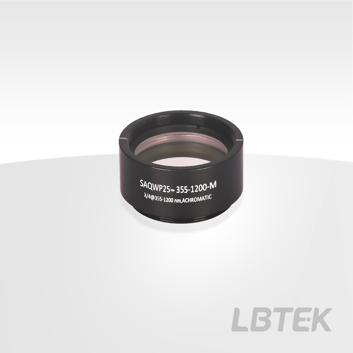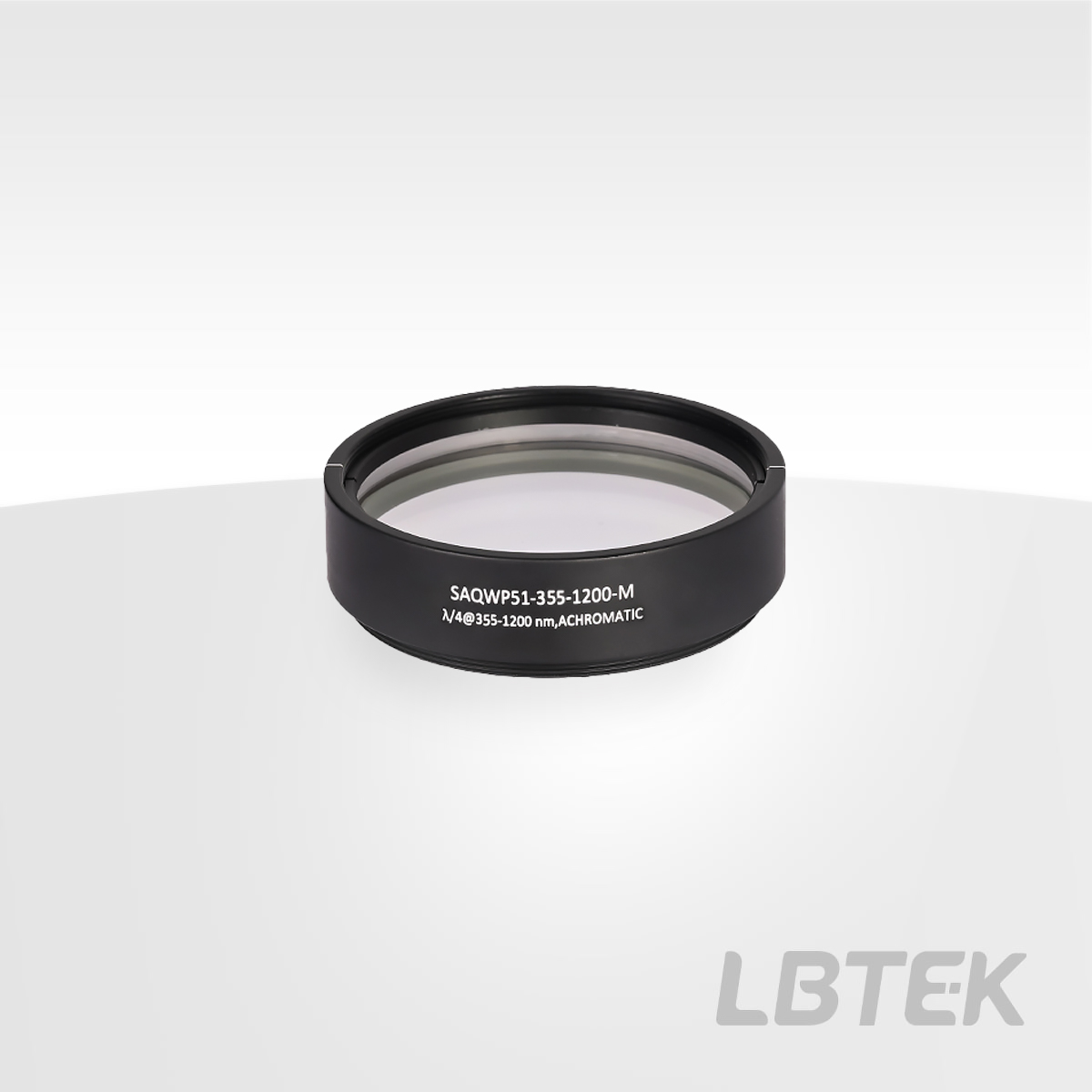 LBTEK's super achromatic quarter-wave plate with a clear aperture of Ø45 mm is composed of three quartz wave plates and three MgF2 wave plates bonded together. By controlling their relative angles, it achieves an ultra-broadband achromatic effect. Standard products are available with working wavelength ranges of 355-1200 nm and 600-2200 nm, both mounted in standard SM2 lens tubes. The surface is engraved with product model, retardation, design wavelength, and fast axis direction for easy identification and use.