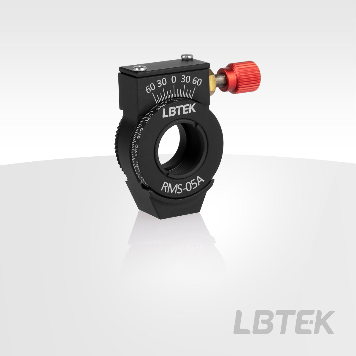 The RMS-05A Rotating Mount is specifically designed for Ø1/2 inch optical elements, enabling 360° continuous manual coarse adjustment and backlash-free fine adjustment. Its SM05 (0.535"-40) internal threaded hole is compatible with Ø1/2 inch optical elements with a maximum thickness of 5.9 mm. The optical element is secured by the rear internal lip together with the standard SM05 retaining ring.