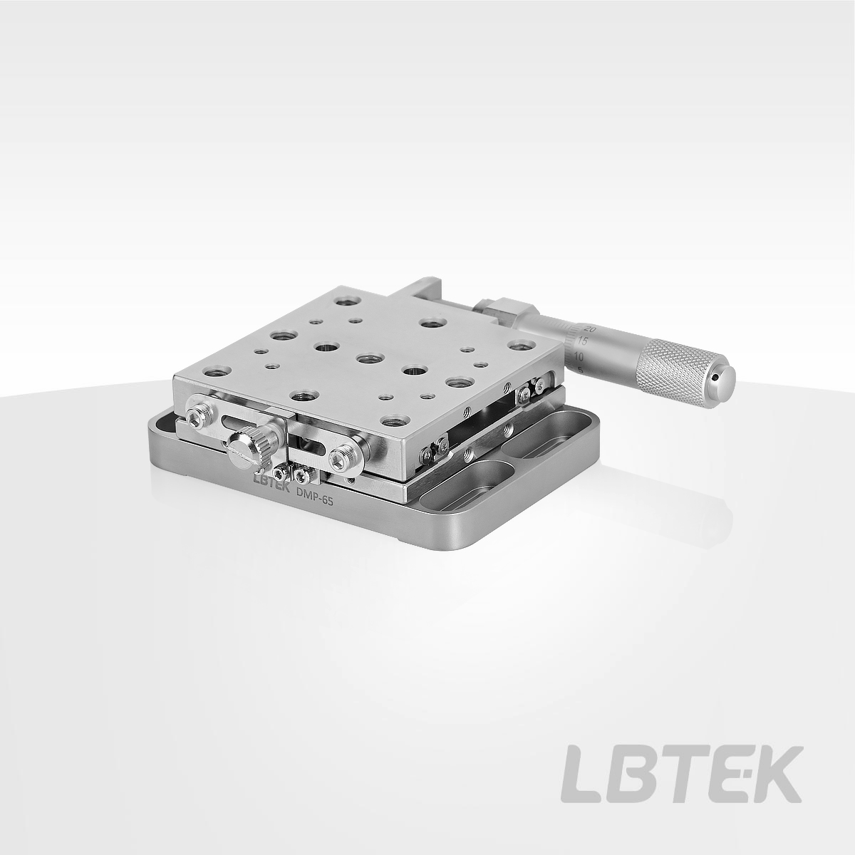 The XYZ-axis linear translation stage from LBTEK incorporates a differential micrometer head structure with end direct drive. It provides coarse adjustment of 13 mm travel (10 μm minimum graduation) and fine adjustment of 200 μm travel (0.5 μm minimum graduation). The 65 mm × 65 mm stage surface features M6 tapped holes. Four U-shaped slot positioning holes on the base enable stage securing with M6 screws.