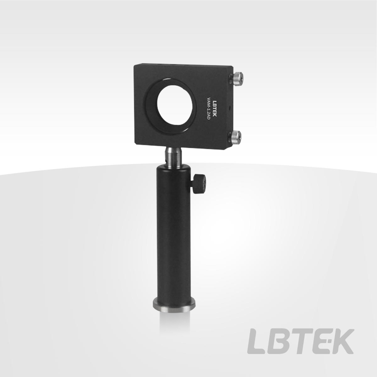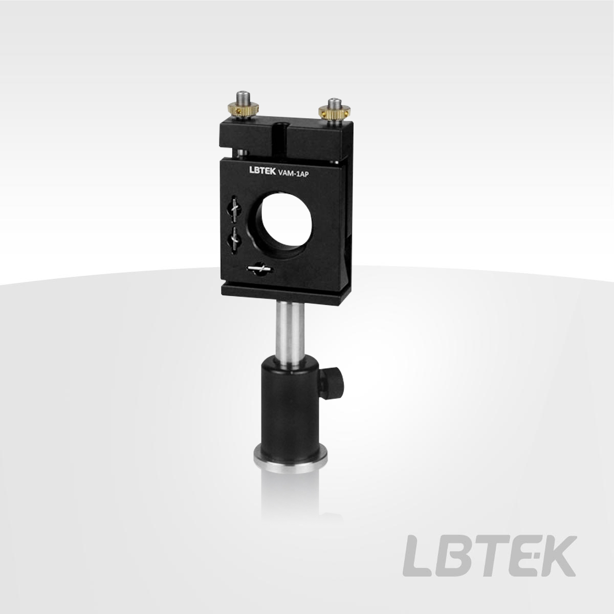 LBTEK Vertical Adjustment Mirror Mount, designed for mounting optical components with a diameter of 25.4 mm and a maximum thickness of 6.2 mm, secured by a retaining ring. It offers an adjustment range of ±2.5°, with adjustment precision of 0.27°/rotation for pitch and 0.22°/rotation for yaw. Equipped with 2 M5×0.25 adjusters featuring lock nuts, it can be adjusted using the included HWS-2 knurled 2.0 mm hex keyh or a standard 2.0 mm hex key. The vertical adjustment mount features 2 Ø3 mm pin holes, 2 M4 threaded holes, 2 8-32 threaded holes, and 1 countersunk hole for M4 at the base, allowing mounting on posts or various other mounting devices. All the optical axis center height is 25.4 mm.