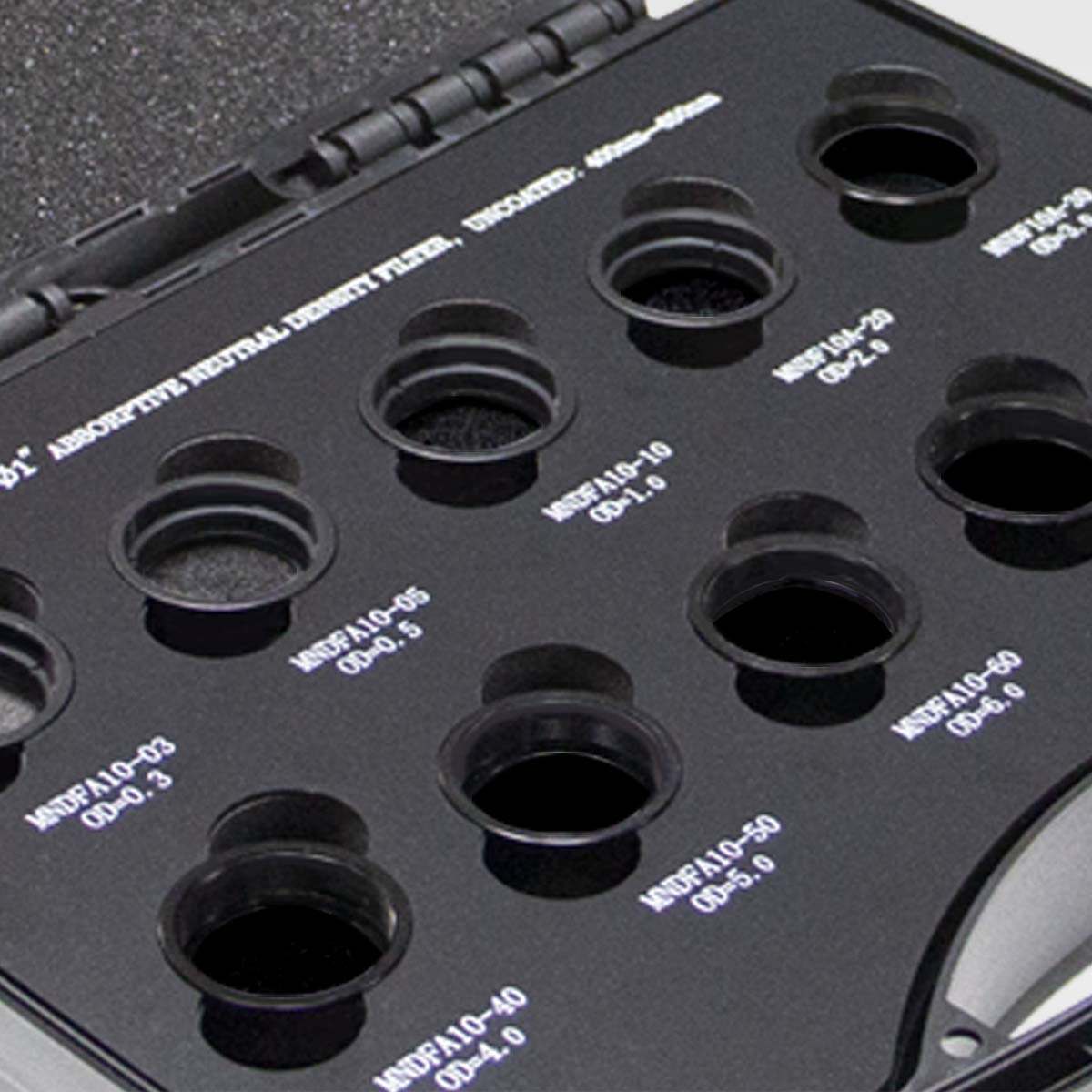 The LBTEK Neutral Density Filter Kits include commonly used OD (0.2-8.0) filters, currently offering both Absorptive and reflective filter kits as options. LBTEK also provides customized services for special configurations, such as the number of filters, dimensions, OD values, etc. For specific customization requirements, please contact LBTEK Technical Support.