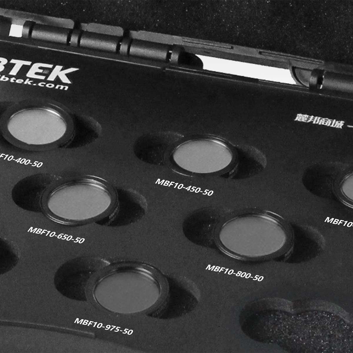 The LBTEK Bandpass Filter Kits includes filters with different wavelengths and FWHMs. Currently, filter kits with spectral FWHM of 25±3 nm and 50±5 nm are available. LBTEK also offers customizable filter combinations, such as filter quantity and size. For specific customization requirements, please contact LBTEK Technical Support.