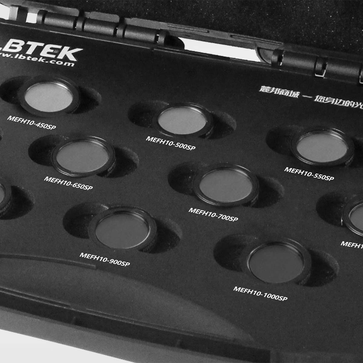 The LBTEK Quality Edgepass Filter Kits includes 10 or 8 mounted shortpass or longpass filters. Currently, we offer optional filter kits for visible or infrared light. LBTEK also offers customizable filter combinations, such as filter quantity and size. For specific customization requirements, please contact LBTEK Technical Support.