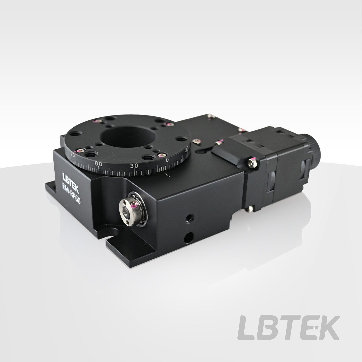 The motorized rotary translation stage from LBTEK provides 360° continuous rotation motion, with a circumferential scale of 2° and a resolution up to 0.001° or 0.0018° subdivision. Precise rotational motion control is achieved by a stepping motor driving a worm gear mechanism that actuates the slide stage, which operates on deep groove ball bearing slides. The base features three or four M6 countersunk holes for installation onto optical tables or custom-built stage models using included three or four M6 socket head cap screws. The EM-RP40 platform surface has a set of M6 tapped holes evenly distributed on a Ø25 mm reference diameter circle with an SM05 tapped through-hole at the center. The EM-RP60 translation stage includes a set of 22 mm-spaced M4 tapped holes, a set of 30 mm-spaced M3 tapped holes, and a set of Ø50 mm reference diameter M6 tapped holes, with an SM1 tapped through-hole at the center. The EM-RP100 stage features a set of M6 tapped holes evenly distributed on a Ø75 mm reference diameter circle with an SM2 through-hole at the center. Users can install optical components or assemble optical systems using mechanical parts with the same thread specifications. The motorized rotary translation stage requires a motorized stage controller. LBTEK offers the EM-CV5-x series controllers for selection. Note: The corresponding motorized rotary translation stages do not include optical component retaining rings.