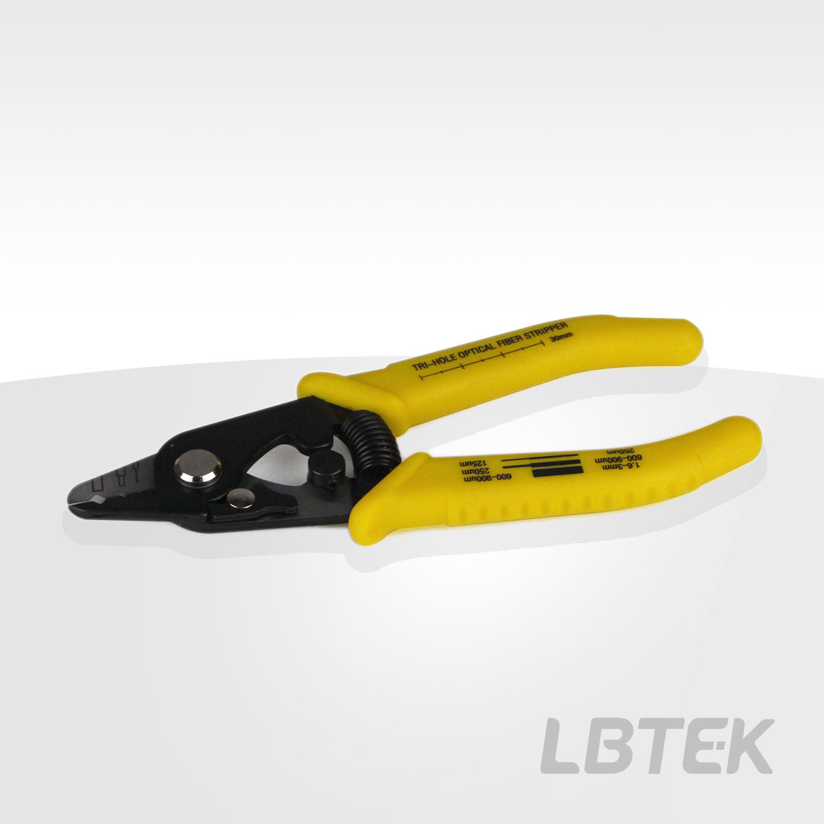 The LBTEK three-port fiber optic stripper can perform common fiber stripping functions. The large hole can be used to strip 2-3 mm fiber outer jackets, the medium hole for stripping 900 μm buffer coatings, and the small hole for stripping 250 μm coatings (all are factory-default apertures). The LBTEK Triple-Hole Fiber Optic Stripper comes pre-configured from the factory, and users can rotate the adjuster to modify the aperture (Note: Manual adjustment cannot be reset to factory defaults with a single click). Ensure the safety lock is released before use for normal operation.