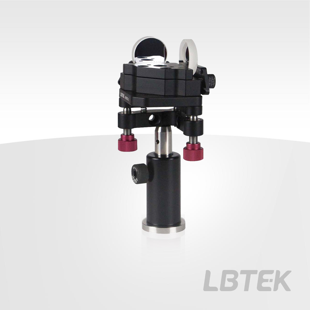 The LBTEK Optical Delay Line Mirror Mount is a versatile fixture for optical delay applications, featuring two orthogonal surfaces for mounting standard mirrors. The LBTEK Optical Delay Line Mirror Mount Kit includes the ADM mirror mount and APM3-1 platform mount, which are connected via M4 screws and can be quickly assembled/disassembled using the included hex wrench. Each clamping plate of the ADM mount contains two thumb screws, two springs, and two plastic rods for securing optical component. The mount features two precision-machined mounting surfaces to ensure standard mirrors are positioned at an exact 90-degree angle to each other, enabling input beams to undergo optical delay through dual reflection while maintaining parallel output. The APM3-1 platform mount provides ±4° pitch/yaw adjustment via three M6×0.25 fine-thread screws with adjustment precision 0.4°/rotation. M4 holes secure the platform onto the optical post.