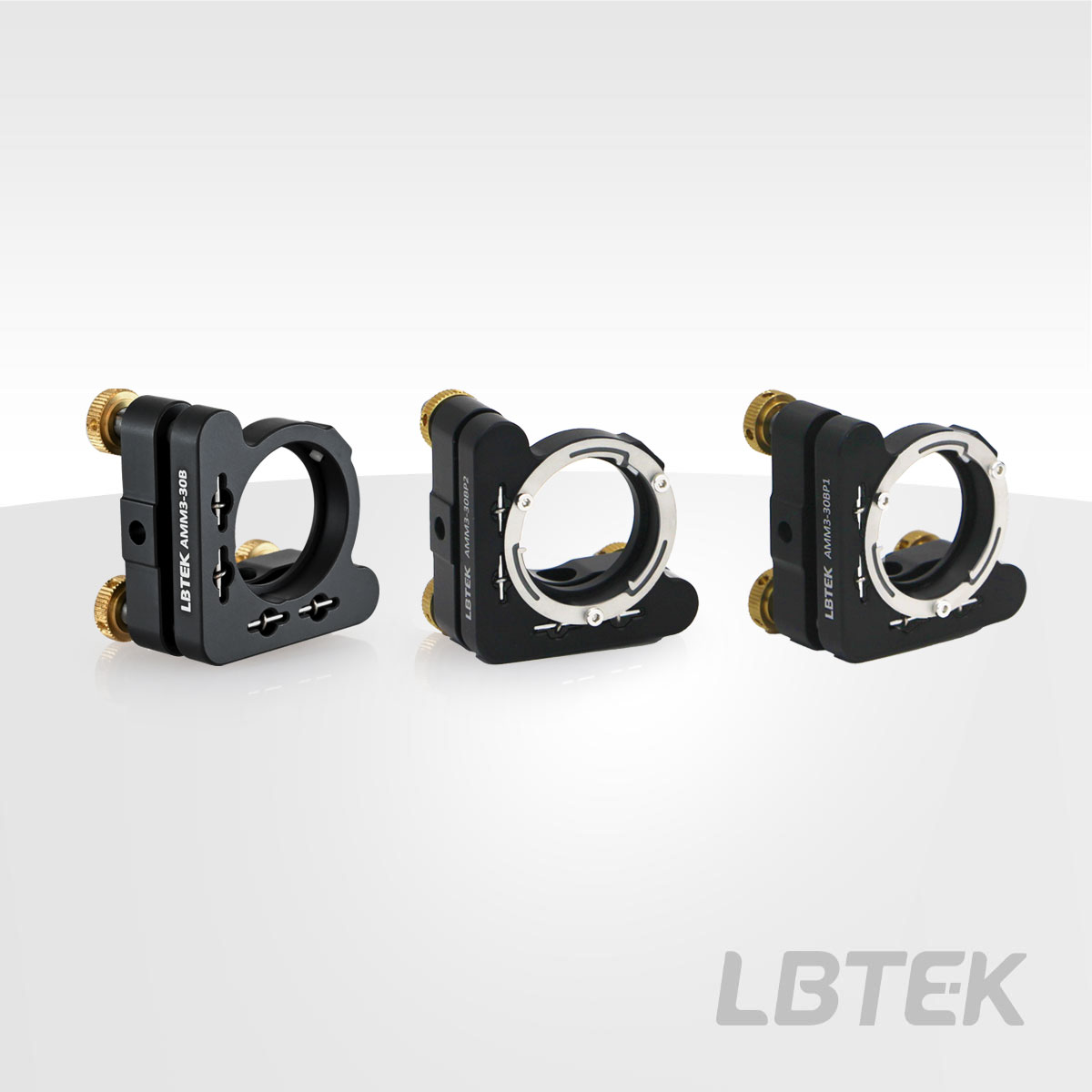 The LBTEK Standard 3-Axis O-Type Optical Mount is for optical components with a diameter of Ø30.0 mm and an optical axis height of 25.4 mm. The base of the mount features counterbore holes for M4 screws to connect mounting rods. The AMM3-30B model uses set screws to secure optical components, suitable for components with a diameter of 30.0 mm and a minimum thickness of 3.0 mm. The AMM3-30BP1 and AMM3-30BP2 models employ a dual clamping mechanism combining set screws with elastic retaining rings. The set screws can secure components with a minimum thickness of 3 mm, while the dual clamping rings accommodate thicknesses of 6.5 mm and 5.0 mm respectively. The mount is equipped with three M6×0.25 precision adjusters that can be locked with locknuts, providing pitch and yaw adjustment ranges of ±4° with 0.4° per revolution. The adjusters do not include knobs and can be operated using a 2.0 mm hex wrench or a knurled hex wrench (HWS-2). Purchasing LBTEK Standard 3-Axis O-Type Optical Mount includes one 2.0 mm hex wrench and two M4 socket head cap screws as complimentary accessories.