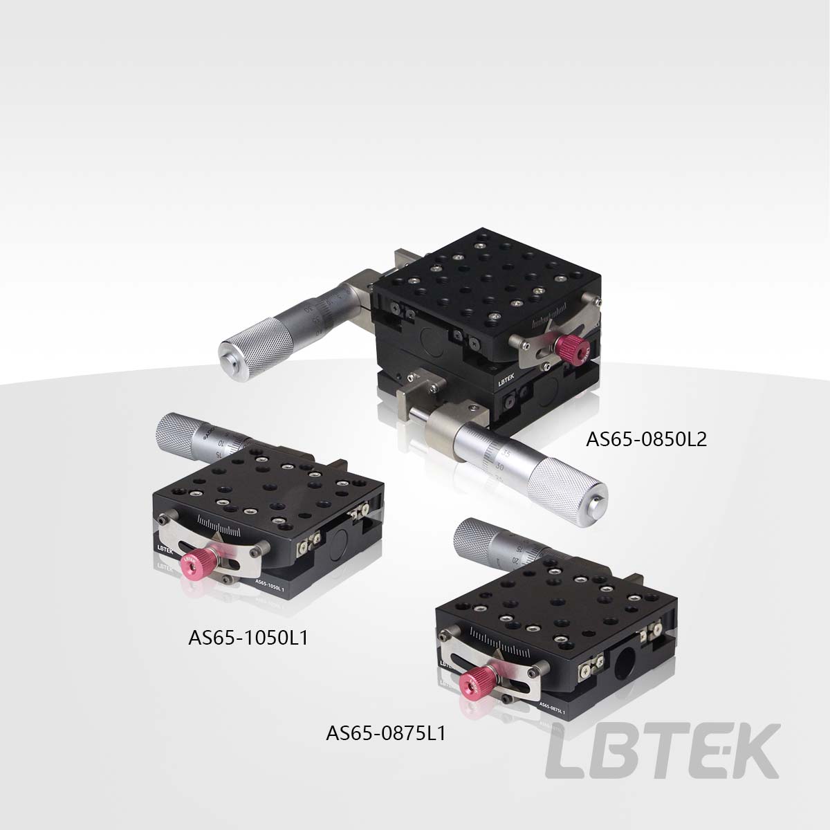 The manual angular translation stage from LBTEK provides unobstructed, pure rotary movement within a specified angular range. Featuring a compact and stackable design, these stages can be mounted in series (the AS65-1050L1 on the AS65-0875L1) with overlapping rotation points to create dual-axis systems while maintaining coincident centers of rotation for XY angular adjustment. The pre-assembled AS65-0850L2 offers an integrated dual-axis configuration for immediate use. Equipped with a micrometer drive for precise and repeatable positioning, each stage includes a 1° graduated scale on the side for angle measurement. A thumb set screw on the side allows secure fixation at the desired position, while four M6 countersunk holes on the base enable mounting onto breadboards, optical tables, or other stages using M6 screws.