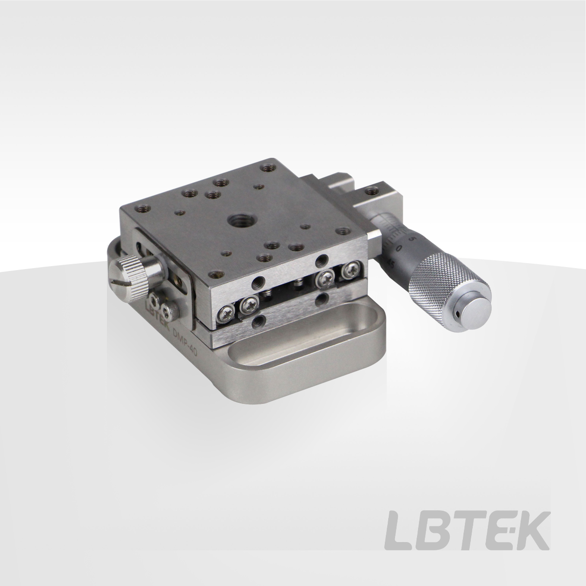 The single-axis linear translation stage from LBTEK is available in three drive types: end direct drive, left-side drive, and right-side drive. All types feature single-axis drive with 1 micrometer driver, providing 13 mm travel and 10 μm minimum graduation. The stage surface measures 40 mm × 40 mm with six M3 tapped holes (four at 32 mm pitch, two at 25 mm pitch), four M2 tapped holes at 20 mm pitch, and one central M6 tapped hole. Specific distribution patterns are detailed in the website drawings.