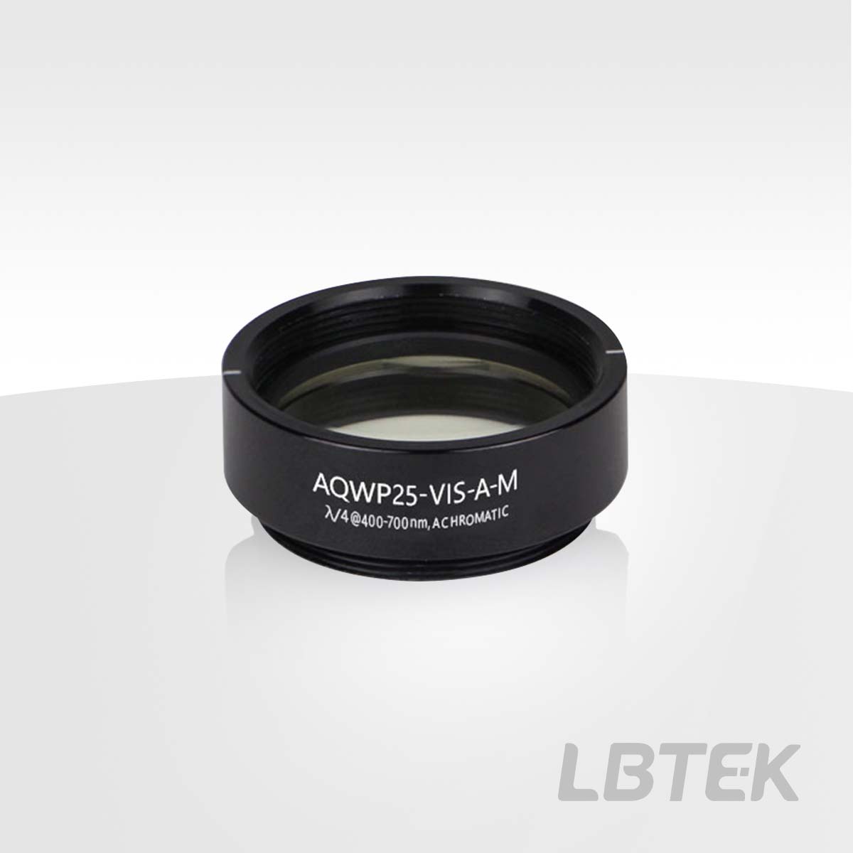 The LBTEK Polymer Achromatic Quarter-Wave Plates are commonly used to convert the linearly polarized light within the designed wavelength range into the circularly polarized light. When the linearly polarized light passes through the achromatic quarter-wave plate, it generates an optical path difference of λ/4 and a phase retardation of π/2. The standard one-inch polymer achromatic quarter-wave plate is mounted in a standard SM1 lens tube, with the product model, retardation value, design wavelength, and fast-axis direction engraved on the tube surface for easy identification and use by customers.
